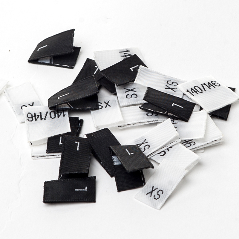 Kindergrößen zum Einnähen. Die Etiketten sind gewebt, gefaltet, und die Größe ist auf Vorder- und Rückseite eingewebt.