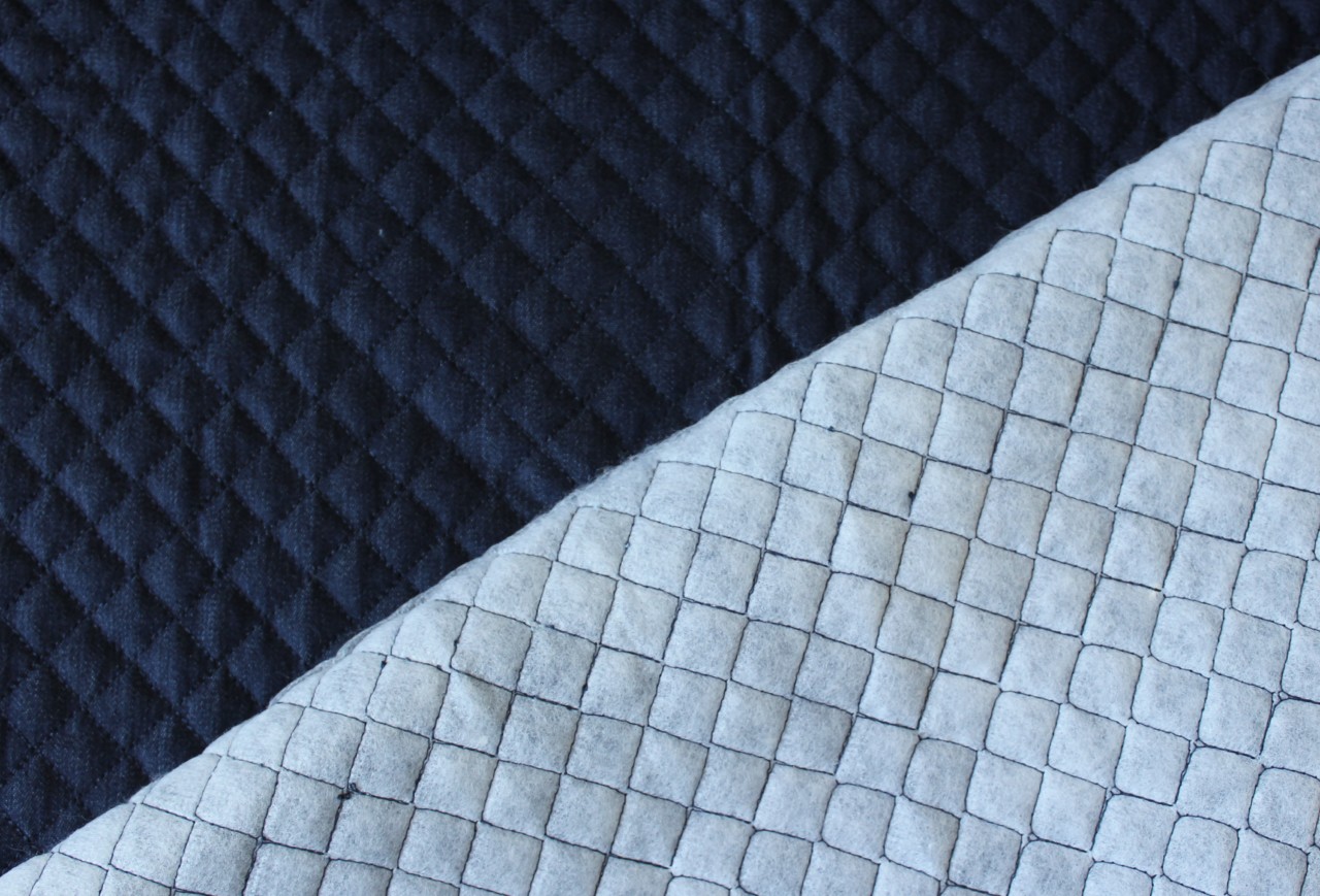 Dieser Stoff besteht aus zwei in Rauten zusammgesteppten Stofflagen – ein leicht dehnbarer Webstoff in Jeansoptik und eine Vlieslage. Linke Seite Polyestervlies, rechte Seite Jeans.